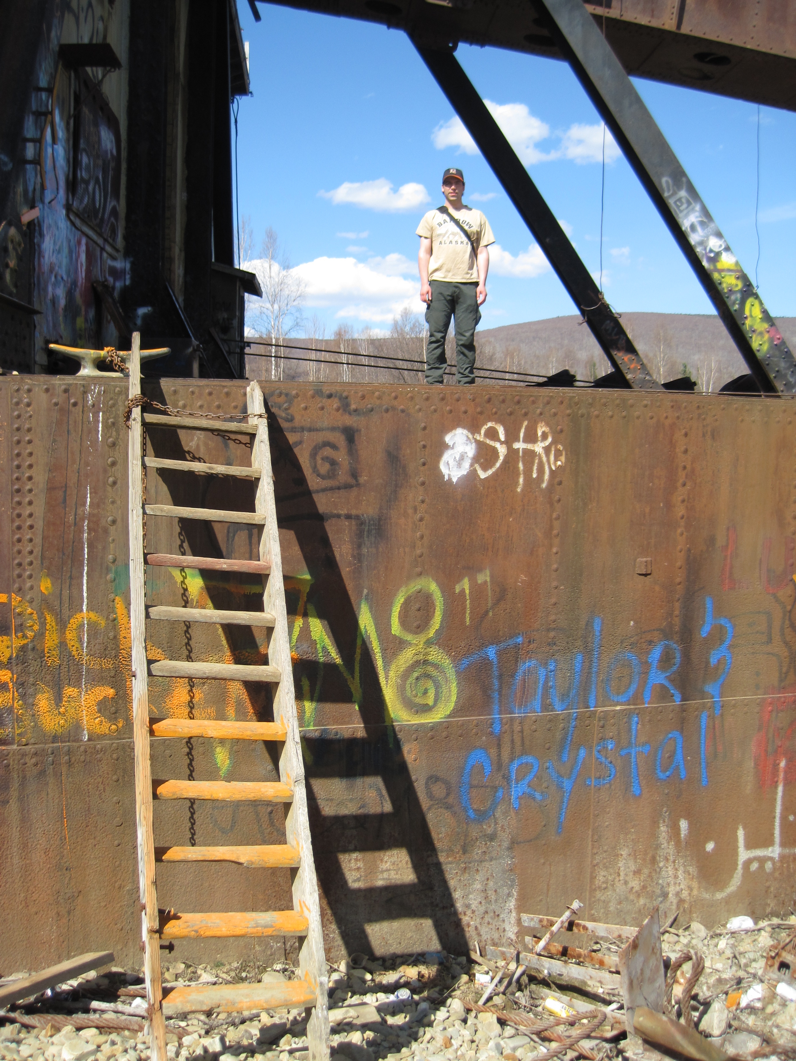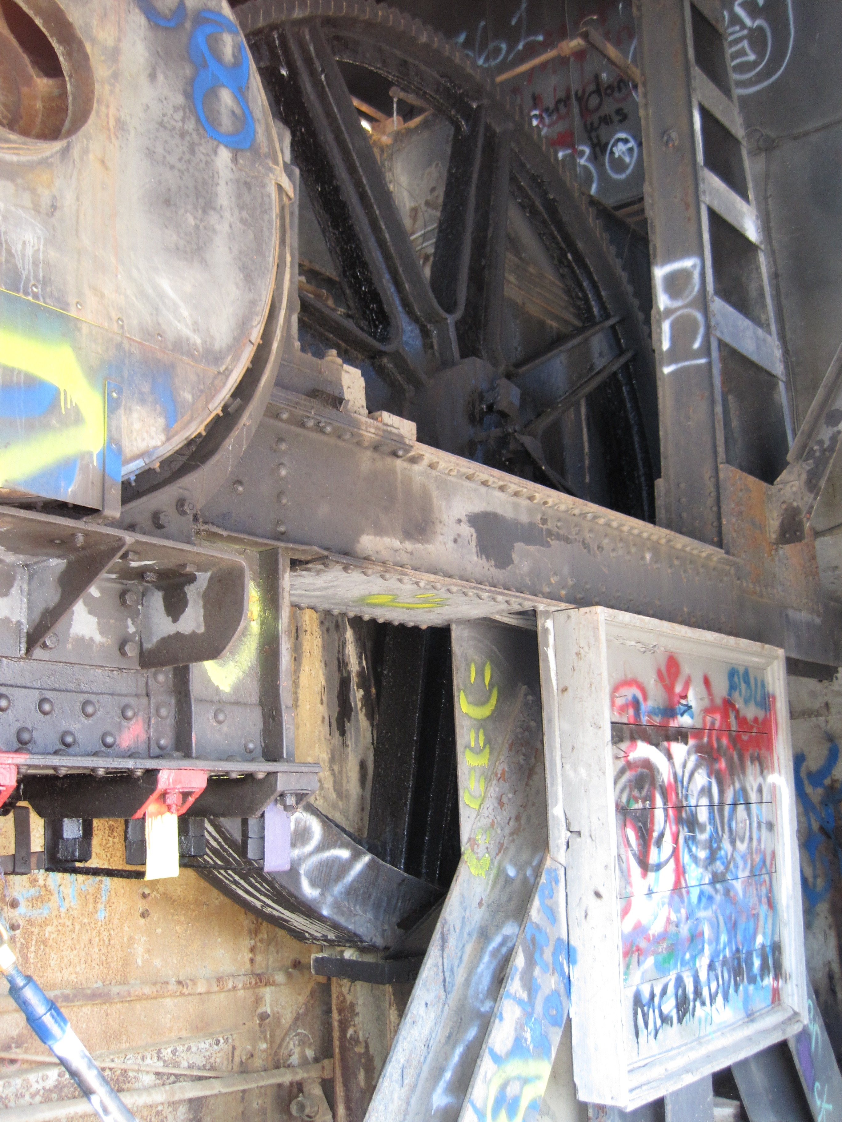 The abandoned machine, built in the 1930s, was five stories tall, and yet it built a mound of rock that almost hid it from the road. It was an ankle twisting walk on rock tailings down to the rickety wooden ladder that allowed us to trespass on it’s decks.