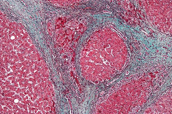 High magnification micrograph of a liver with cirrhosis, a disease in which healthy liver tissue is replaced with scar tissue. (Nephron/Wikimedia Commons)