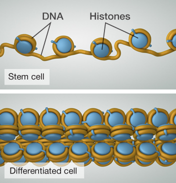 The loose adaptive structure of a stem cell, above. Differentiated cell below. Image from http://learn.genetics.utah.edu/content/