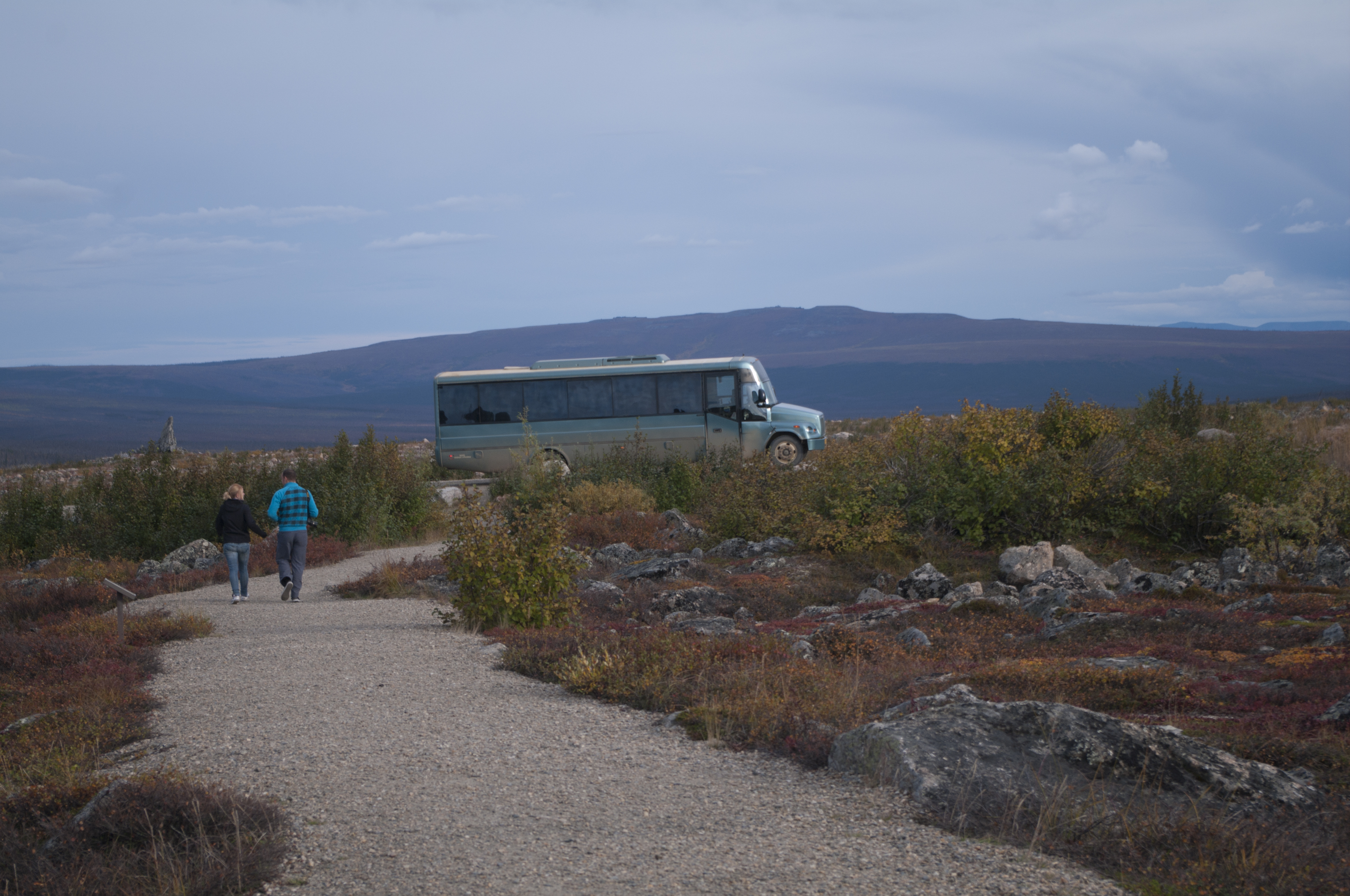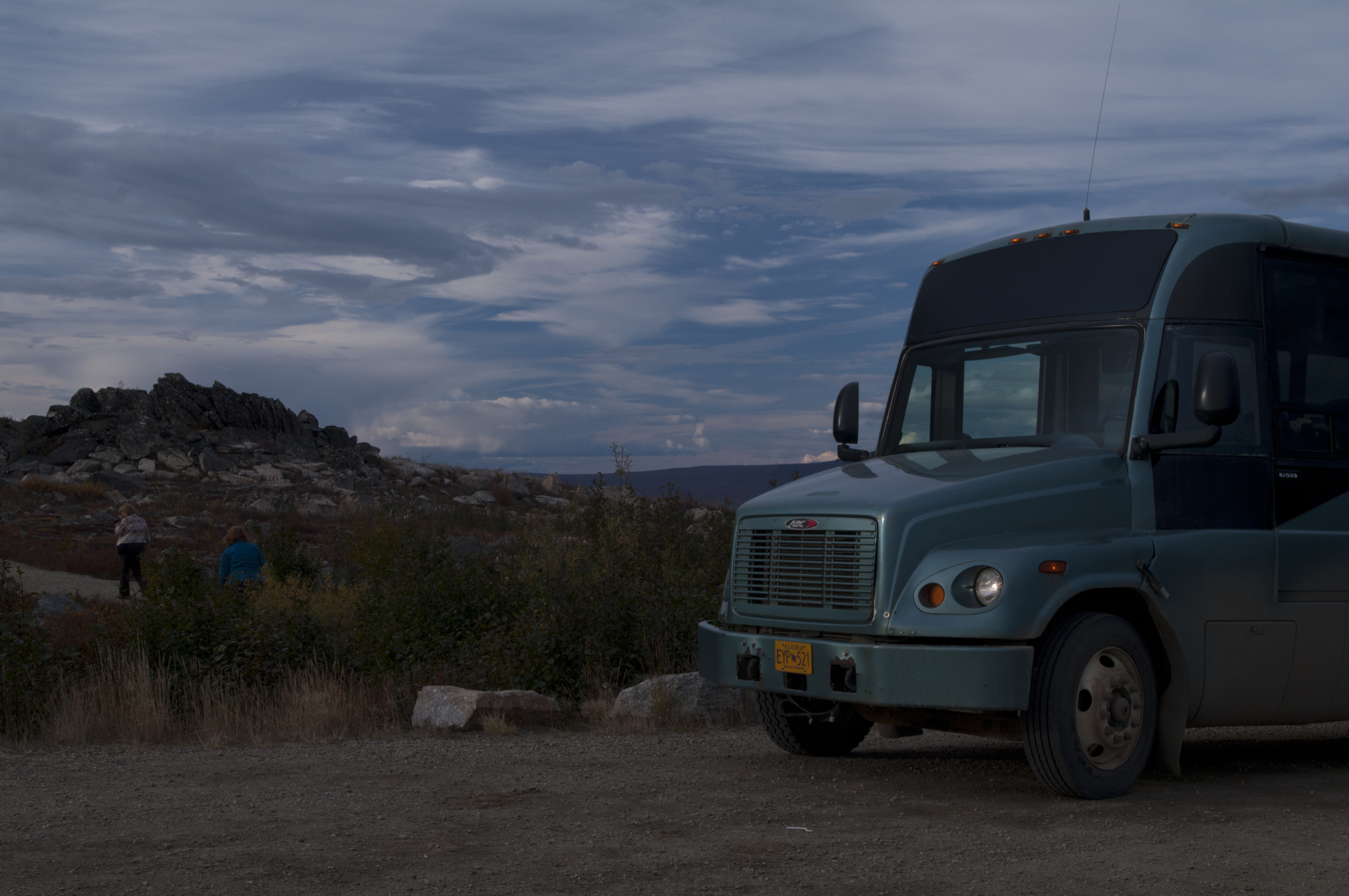 The rolling tundra stretches on for miles and the tour coaches’ diesel engine rattles. We stop for a twenty minute break so the visitors to Alaska can see the first real stretch of tundra they’ll encounter today. The dozen people I am shepherding to the Arctic Circle on this fourteen hour tour spread out down the small quarter mile path to the promontory which looks out over a red and gold autumn patchwork of short shrubs.