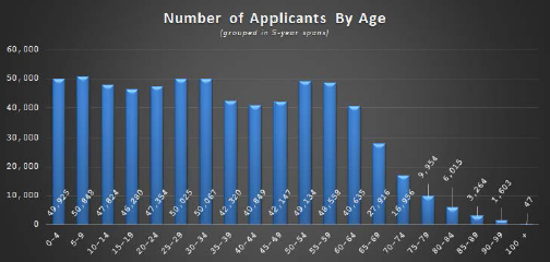 There are high numbers of young children on file, then there is a dip in the number of 15-19 year-olds. Maybe young people leave for college or just go to see what else is out there. I hear from a lot of out-of-state college students and often, their helicopter parents, asserting they will be back when they finish school. Statistically however, they are least likely to return after an allowable absence.